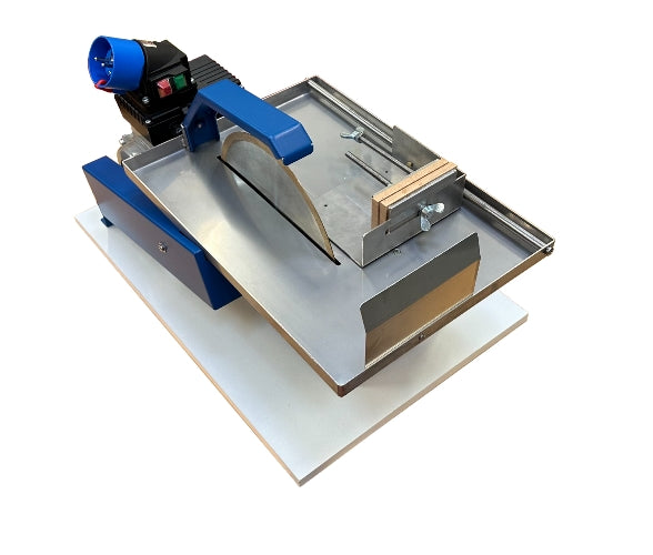 Una sega per pietra dalla solida costruzione (MADE IN AUSTRIA) con lama diamantata sinterizzata da Ø 250 x 1 mm per il taglio di minerali, pietre preziose, pietre semipreziose, fossili, pietre di ruscello, ciottoli e vetro. La macchina è di alta qualità e costruita con precisione. Tavolo da taglio, morsetto per pietra con asta di guida e albero in acciaio inossidabile. Alloggiamento (serbatoio dell'acqua) e copertura della cinghia trapezoidale in lamiera d'acciaio con verniciatura a polvere blu.