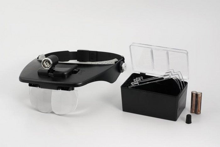 Lente d'ingrandimento per fascia in plastica nera. È possibile collegare un totale di 2 lenti alla lente d'ingrandimento sull'archetto, consentendo molti ingrandimenti diversi. Con una coppia di lenti il peso è di ca. L'illuminazione collegata con 2 LED è mobile, può essere accesa e spenta ed è alimentata da 2 batterie micro AAA (incluse). Grazie al LED a risparmio energetico, le batterie hanno una durata 10 volte superiore a quella delle normali lampadine.