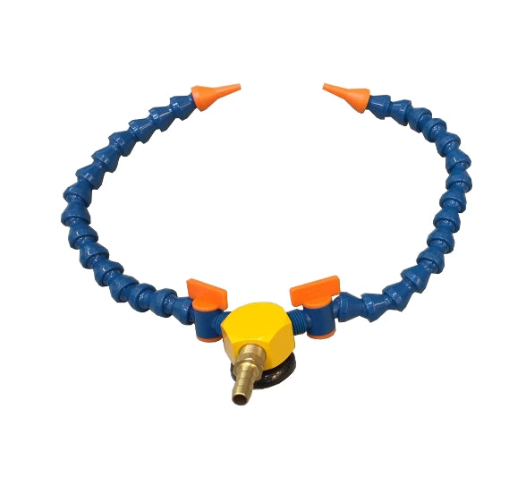 Tubo di raffreddamento con forte base magnetica, 2 bracci. 2 bracci particolarmente adatti per seghe. Il refrigerante, ad esempio l'acqua, può essere iniettato nello spazio di taglio da entrambi i lati.
